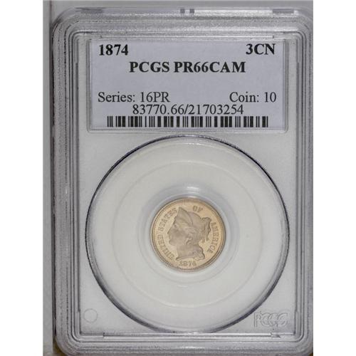 <B>1874<3CN> PR66 Cameo PCGS.</B></I> Lovely reddish-gold color adorns the well struck surfaces, and wispy die striations are prominent on both obverse and reverse. Mild cameo contrast is evident, and there are no hairlines or handling marks to be found. Population: 11 in 66 Cameo, none are finer (2/06).