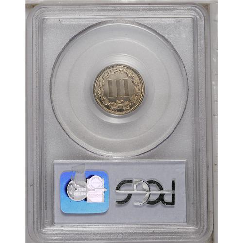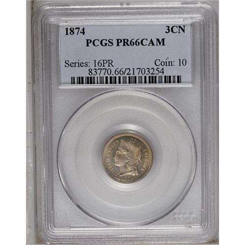 <B>1874<3CN> PR66 Cameo PCGS.</B></I> Lovely reddish-gold color adorns the well struck surfaces, and wispy die striations are prominent on both obverse and reverse. Mild cameo contrast is evident, and there are no hairlines or handling marks to be found. Population: 12 in 66 Cameo, 0 finer (7/06).