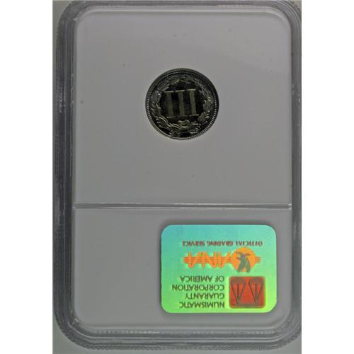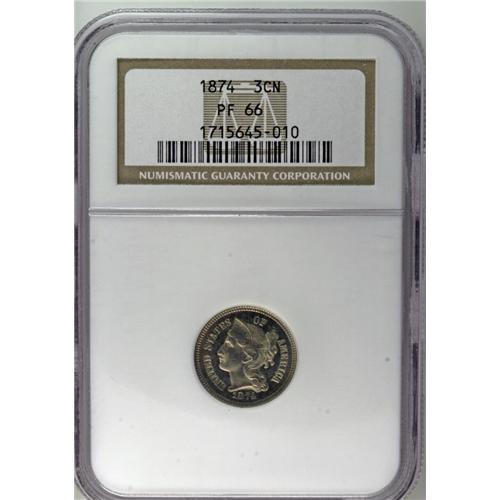 <B>1874<3CN> PR66 NGC.</B></I> A splendid Gem proof example with attractive gold toning over medium-gray surfaces. Traces of blue and lilac color can be seen near the borders, especially on the reverse. Census: 21 in 66, 1 finer (8/06).