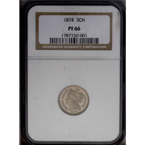 1874 3CN PR66 NGC. A veneer of smoky-gray patina is im 1874[3CN] PR66 NGC.