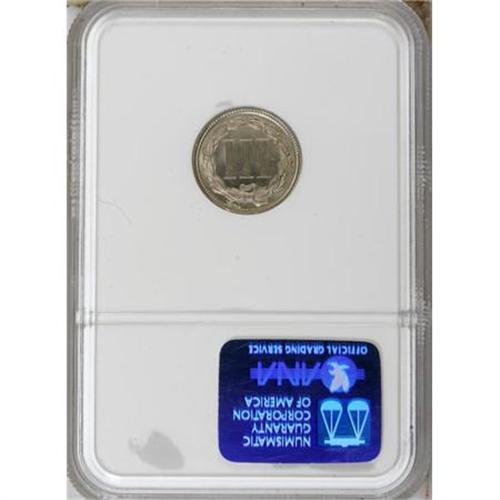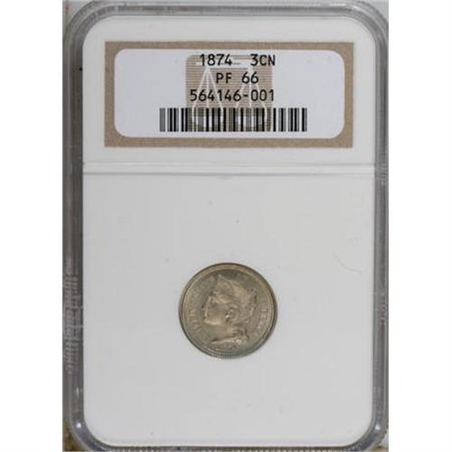 <B>1874 3CN PR66 NGC.</B></I> Freckles of gold-tan color appear to float over nickel-gray surfaces that exhibit nice field-motif contrast at all angles. Sharply struck, and devoid of mentionable marks. Census: 23 in 66, 1 finer (7/07).<BR><BR><B>Coin Engraver:</B> James B. Longacre<BR><BR><b>Shipping:</b> Coins & Currency (<a target="_blank" href="http://www.heritageauctions.com/common/shipping.php">view shipping information</a>)