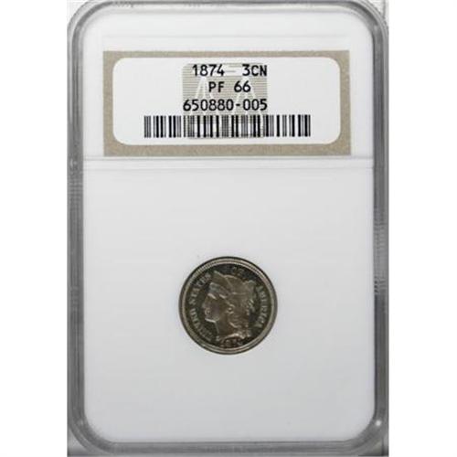 <B>1874 3CN PR66 NGC.</B></I> An impressively struck three cent nickel proof displaying whispers of light gold-tan patina. Well preserved throughout. Census: 24 in 66, 1 finer (1/08).<BR><I>From The Southwest Collection.</B></I><BR><BR><B>Coin Engraver:</B> James B. Longacre<BR><BR><b>Shipping:</b> Coins & Currency (<a target="_blank" href="http://www.heritageauctions.com/common/shipping.php">view shipping information</a>)