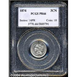<B>1874<3CN> PR66 PCGS.</B></I> Steel-blue and rose hues lightly endow this well struck and impressively preserved premium Gem. A scarcer proof date, all post-1878 issues are more available. Population: 20 in 66, 1 finer (9/04). <BR><BR><B>Important notice:</B> Heritage usually auctions material at the rate of 200-250 lots per hour. On some occasions eBay Live bid software or the Internet may not be able to keep up with the pace of the auction. We recommend placing a realistic absentee bid now as insurance to avoid disappointment. Occasionally the auctioneer may eliminate or reject an eBay Live bid, and the auctioneer may also reopen a lot after the close of the eBay live bidding (usually because we missed an audience bid), and may reject your bid even if it shows you as the winning bidder. By bidding via eBay Live, you agree that Heritage may award the lot to another bidder at its sole discretion under the circumstances described above or any other reasonable circumstances. Since eBay bids are not shown to us until we open the lot on the floor, we treat those bids just like floor bids. In most cases the floor responds before the eBay bid is presented to us, due to Internet lag time, so for consistency we have made it a policy that floor bids are always considered first over tie eBay live bids. Also please note that all Heritage lots purchased through eBay Live carry a 20% Buyer's Premium. Please make sure you read the Terms and Conditions before you bid.