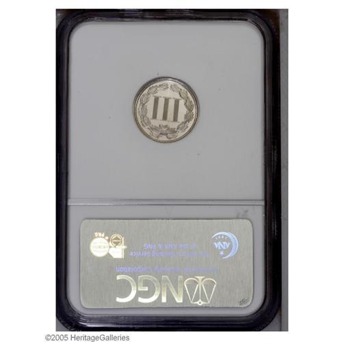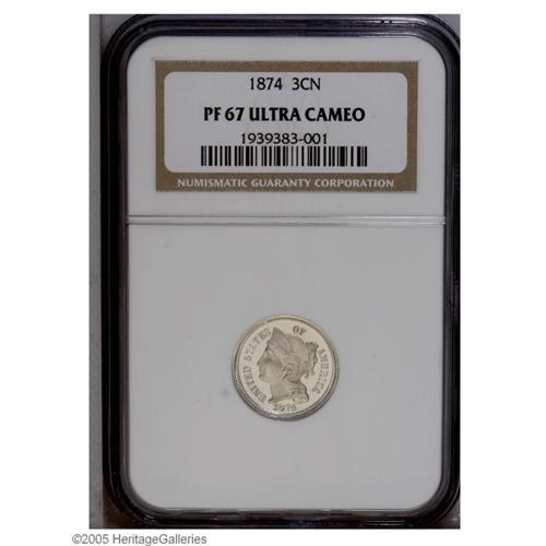 <B>1874<3CN> PR67 Deep Cameo NGC.</B></I> Abounding mint frost on the devices contrast with the problem free fields that show some evidence of die striations. Brilliant and completely untoned overall.