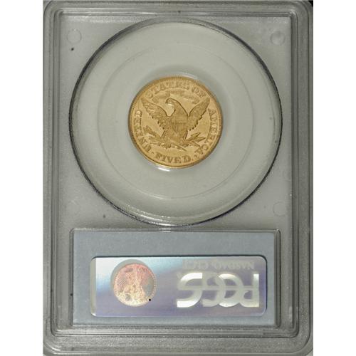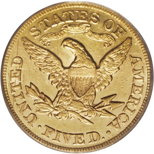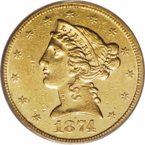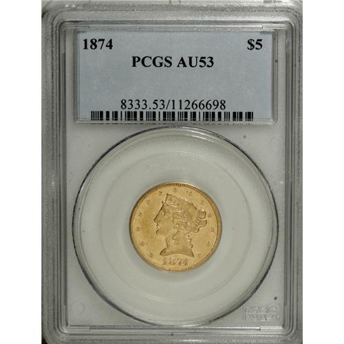 <B>1874 $5 AU53 PCGS.</B></I> Relatively few 1874 half eagle survivors exist from the 3,488-piece mintage, and less than 130 examples in all grades have been seen by PCGS and NGC. The AU53 specimen presented here retains considerable luster on yellow-gold surfaces, and exhibits well defined motifs. An even scattering of small marks is noted on each side.<BR><BR><b>Shipping:</b> Coins & Currency (<a target="_blank" href="http://www.heritageauctions.com/common/shipping.php">view shipping information</a>)