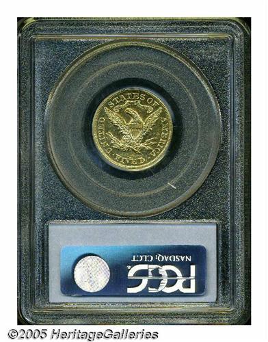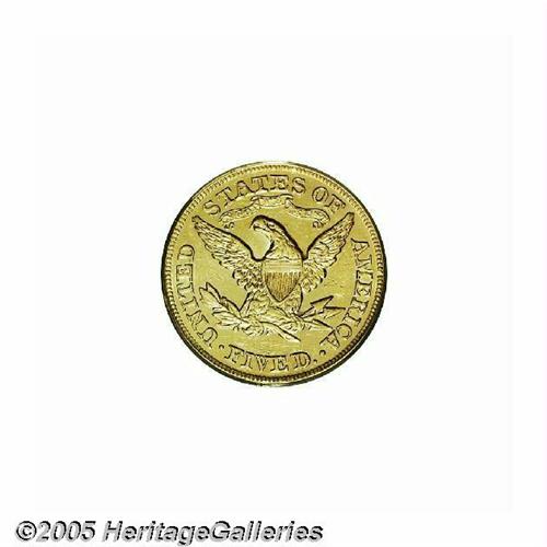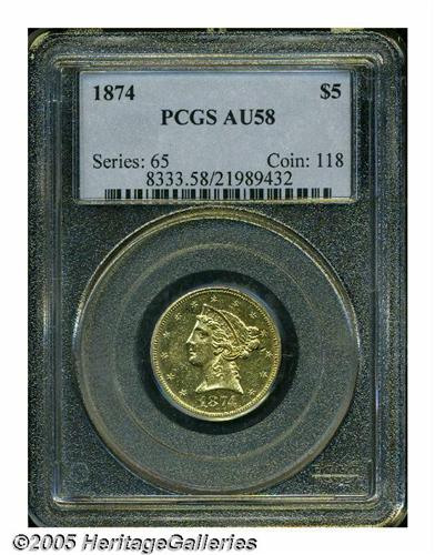 <B>1874<$5> AU58 PCGS.</B></I> In a year when small gold production in Philadelphia was more focused on the Three Dollar piece, just 3,488 Half Eagles were minted for commercial purposes. This is a bright yellow-gold example with much of its reflective luster still in evidence. Contact marks are well populated, particularly over the obverse. Population: 2 in 58, 3 finer (5/05).