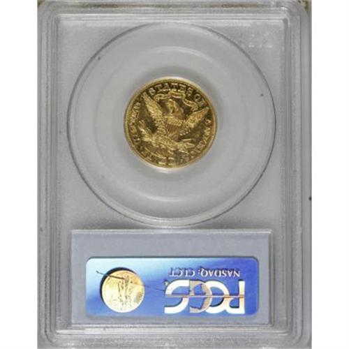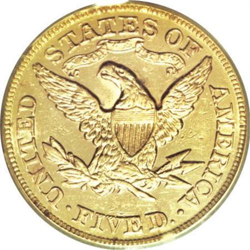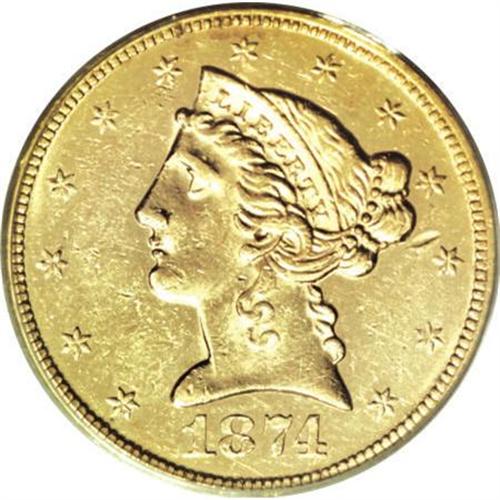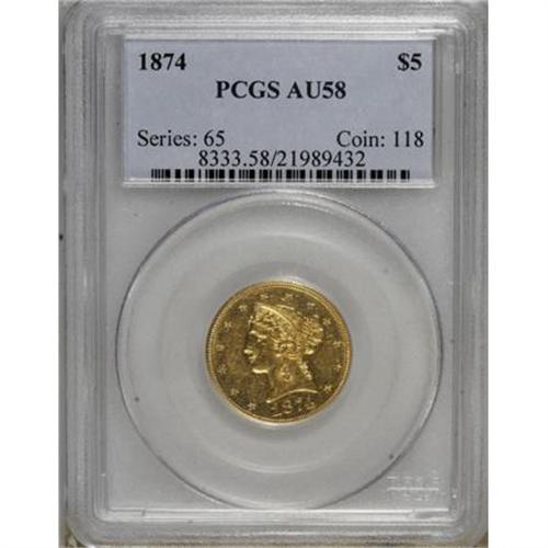 <B>1874 $5 AU58 PCGS.</B></I> In a year when small gold production in Philadelphia was more focused on the three dollar piece, just 3,488 half eagles were minted for commercial purposes. This is a bright yellow-gold example with much of its reflective luster still in evidence. A solid strike leaves excellent definition on the design elements. Light marks are evenly scattered about, the most noteworthy beneath the bun. Population: 2 in 58, 3 finer (3/08).<BR><BR><B>Coin Engraver:</B> Christian Gobrecht<BR><BR><b>Shipping:</b> Coins & Currency (<a target="_blank" href="http://www.heritageauctions.com/common/shipping.php">view shipping information</a>)