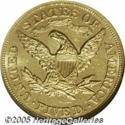 <B>1874 $5 MS61 Prooflike NGC.</B></I> This is an elusive coin in all grades, from a paltry original mintage of 3,508 pieces. Only five coins have been graded in Mint State, by NGC, and, of those five, just two have received the Prooflike designation, this piece and another graded at MS60 Prooflike. The strike on this example is sharp throughout, and the fields show a glittering prooflikeness that is most attractive. There are, however, several distracting marks and some noticeable hairlines in the obverse and reverse fields, which limit the grade. A rare opportunity for the specialist, nevertheless. Population: 1 in 61 Prooflike, 0 finer (2/05).