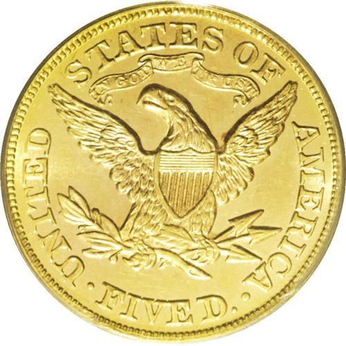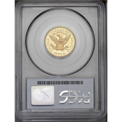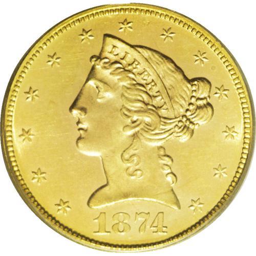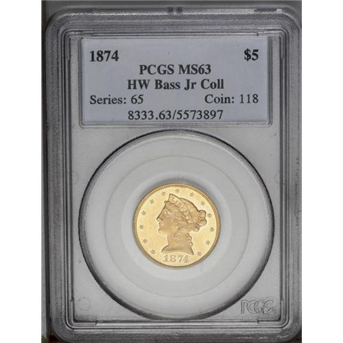 <B>1874 $5 MS63 PCGS.</B></I> In its Bass auction appearance, the cataloger noted, "On the accompanying ticket for this particular coin, Harry Bass wrote, FINEST KNOWN, then emphatically underlined the words. Nearly three decades after his purchase of this specimen, FINEST KNOWN probably still seems to be as accurate as ever." Time continues to pass, and it has been seven years since the Bass II auction. Yet the present piece remains the single finest certified 1874 half eagle, unequalled in business strike format at either PCGS or NGC. Only 3,488 business strikes and 20 proofs were struck. This smooth and prooflike piece has radiant honey-gold fields. This is an example of Breen-6688, with strike doubling on UNITED STATES, that Breen misinterpreted as a doubled die. If it were an Indian half eagle with the distinction of finest certified, it would realize over a hundred thousand dollars. As a Liberty half eagle without a C, D, or CC mintmark, it will sell for less than it should now, but perhaps not so in the future.<BR><I>Ex: Harry W. Bass, Jr. Collection, Part II (Bowers and Merena, 10/1999), lot 1194, which realized $20,125; purchased from N.K.S., 9/27/1971.</B></I><BR><BR><b>Shipping:</b> Coin/Currency (<a target="_blank" href="http://www.heritageauctions.com/common/shipping.php">view shipping information</a>)