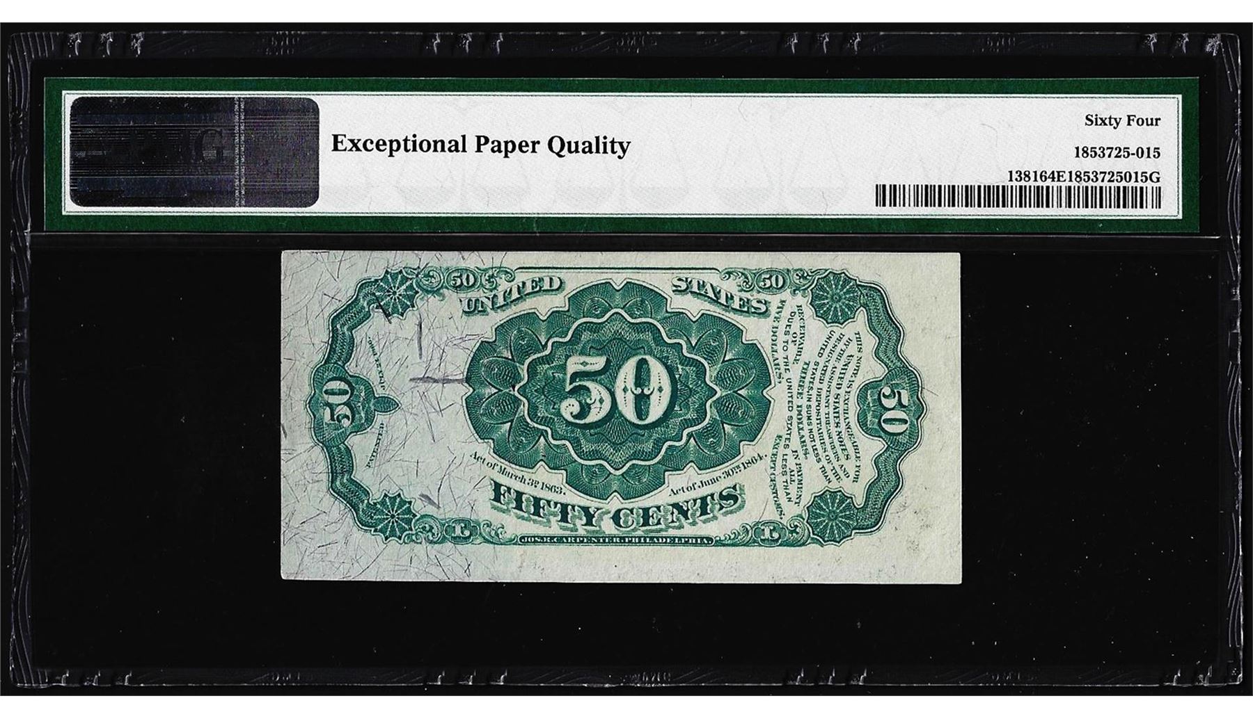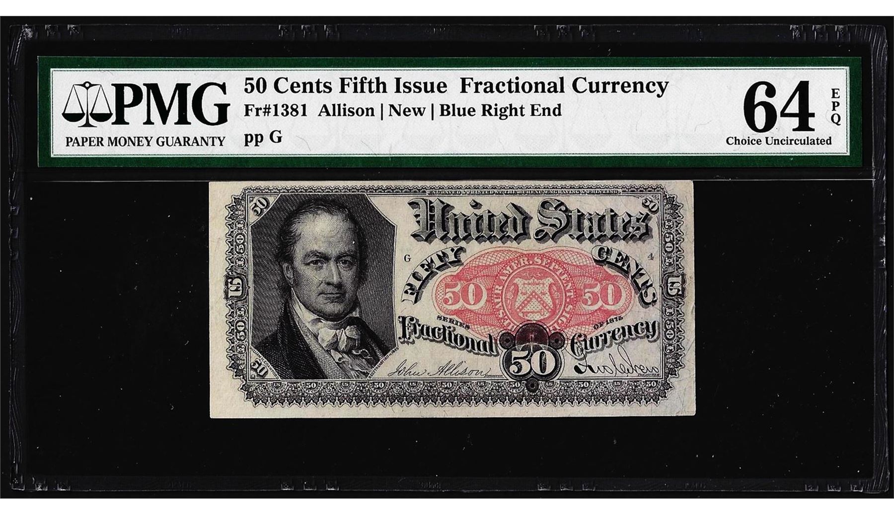One 1874 50 Cent Fifth Issue Fractional Currency Note Fr.1381 PMG Choice Uncirculated 64EPQ. PMG Certified.