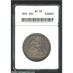 1874 50C Arrows AU58 ANACS. WB-102, Large Arrows. Nicely struck with moderate luster and medium lavender patina. The surfaces are refreshingly free from abrasion. The reverse die has many faint die scratches, as struck. These are noted within the shield, on the wings, within the scroll, and they extend the letters F AM in OF AMERICA.From the Ohio Collection. Important notice: We expect to be auctioning lots at the rate of 200-250 per hour. Sometimes eBay Premier live bid software cannot keep up with that pace, so we strongly recommend that you place a realistic proxy bid now as insurance to avoid disappointment. Also please note that all Heritage/CAA lots purchased through eBay Premier carry a 20% Buyer's Premium. Please make sure you read the Terms and Conditions.