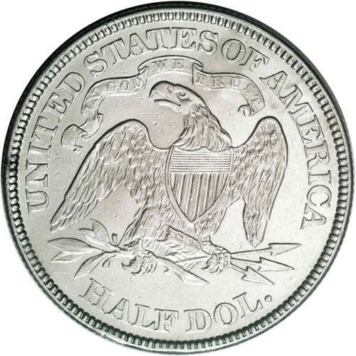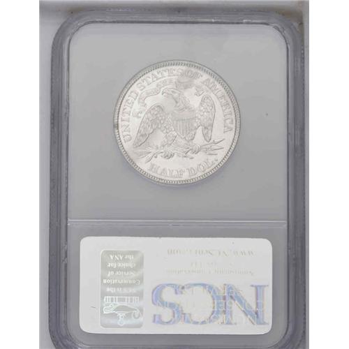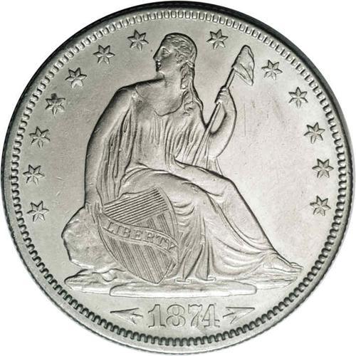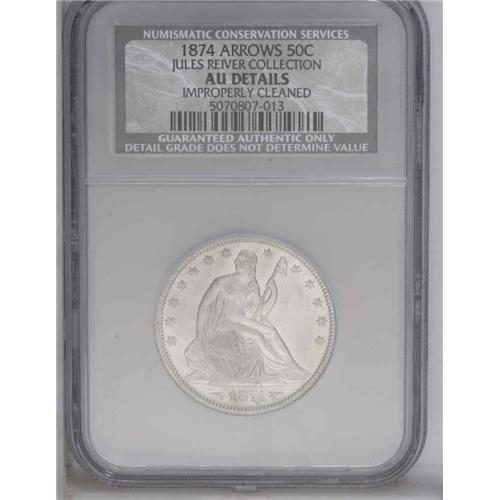 <B>1874<50C> Arrows--Improperly Cleaned--NCS. AU Details.</B></I> WB-103. Large Arrows recut over Small Arrows. Minutely granular in places from a chemical cleaning, this richly detailed type coin nonetheless displays noticeable luster and has no obtrusive marks. Arrows bookend the date on some 1873 and all 1874 Half Dollars, to indicate a slight gain in weight from 12.44 to 12.50 grams.