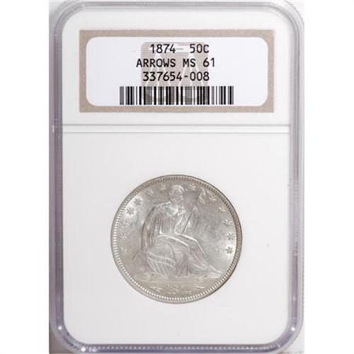 <B>1874 50C Arrows MS61 NGC.</B></I> NGC Census: (16/128). PCGS Population (5/152). Mintage: 2,360,300. Numismedia Wsl. Price for NGC/PCGS coin in MS61: $875. (#6346)<BR><BR><B>Coin Engraver:</B> Christian Gobrecht<BR><BR><b>Shipping:</b> Coins & Currency (<a target="_blank" href="http://www.heritageauctions.com/common/shipping.php">view shipping information</a>)