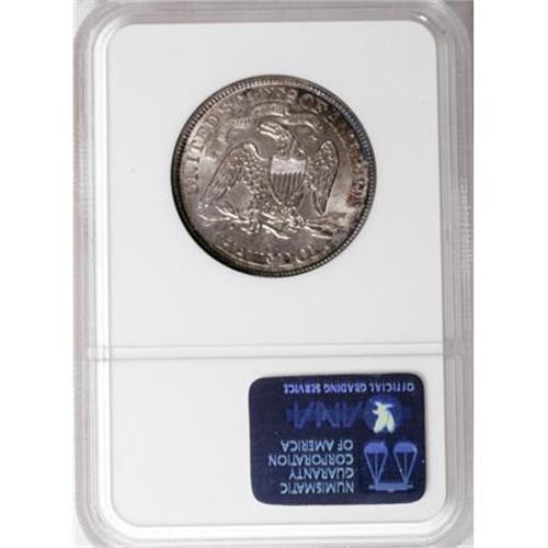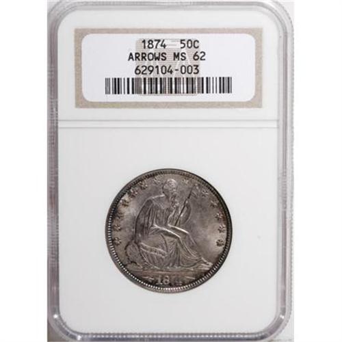 <B>1874 50C Arrows MS62 NGC.</B></I> Radiantly lustrous with mottled purple-rose and cobalt-blue peripheral toning on each side. Sharply struck and nicely preserved, with just two or three small marks on the obverse, and a blemish-free reverse.<BR><I>From The Casa Becca del Norté Collection.</B></I><BR><BR><B>Coin Engraver:</B> Christian Gobrecht<BR><BR><b>Shipping:</b> Coins & Currency (<a target="_blank" href="http://www.heritageauctions.com/common/shipping.php">view shipping information</a>)
