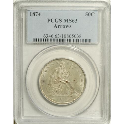 <B>1874 50C Arrows MS63 PCGS.</B></I> WB-102. The Large Arrows subvariety. Milky almond-gold enriches this well struck and unmarked Seated type coin. A pair of small brown spots are of little concern.<BR><BR><b>Shipping:</b> Coins & Currency (<a target="_blank" href="http://www.heritageauctions.com/common/shipping.php">view shipping information</a>)