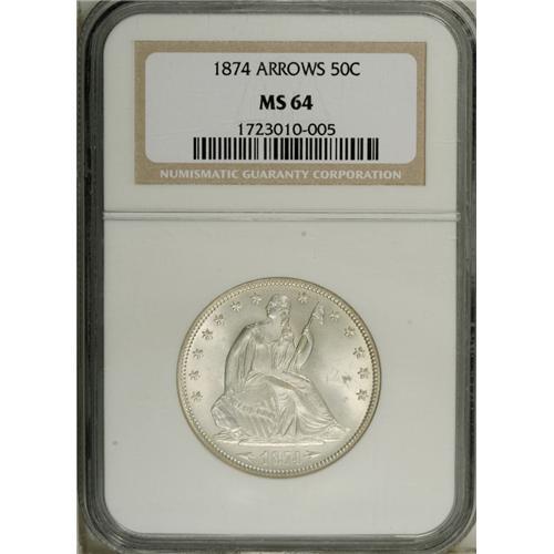 1874 50C Arrows MS64 NGC. Choice and frosty with just