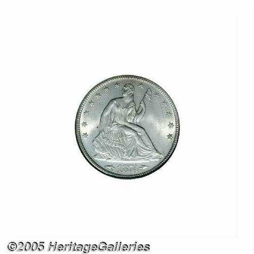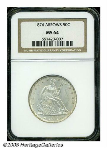 <B>1874<50C> Arrows MS64 NGC.</B></I> Even though 2.36 million pieces were struck of the 1874 half, there are never enough high grade examples extant today to satisfy the demands of type collectors. This is an especially pleasing coin that is brilliant throughout with complete striking details in all areas. Just a few minor, shallow marks keep this lovely coin from an even higher grade. Population: 55 in 64, 27 finer (5/05).