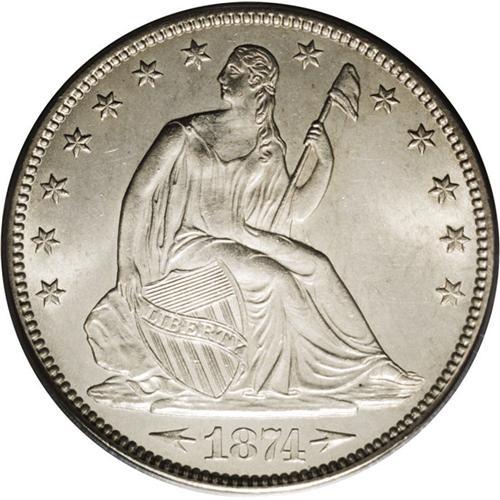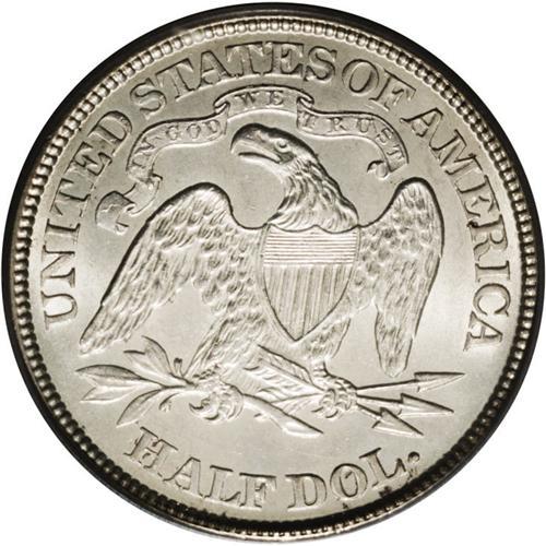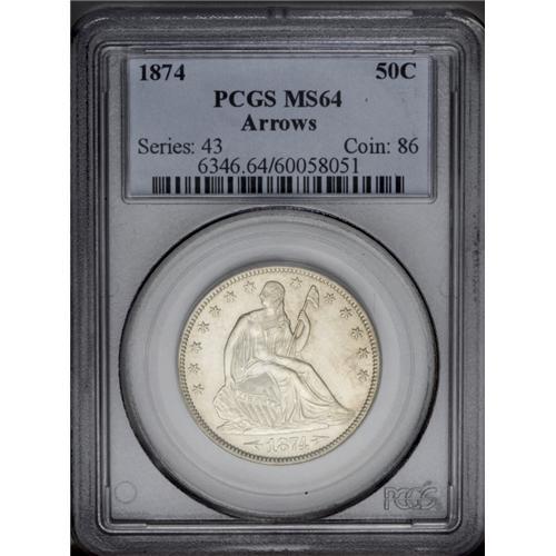 <B>1874<50C> Arrows MS64 PCGS.</B></I> WB-102. The usually seen obverse with large arrows. The reverse of this example has a horizontal spike through the F in HALF, just above the crossbar. A die scratch extends the upper left serif of F in OF, over the top of the O. A wonderful example of the sub-type with satiny luster and brilliant silver surfaces. Hints of champagne color may be seen with careful examination although it is essentially untoned. A sharply struck example with full obverse and reverse details. Even Liberty's head, foot, and the eagle's claws are nicely detailed. <BR><BR><B>Important notice:</B> Heritage usually auctions material at the rate of 200-250 lots per hour. On some occasions eBay Live bid software or the Internet may not be able to keep up with the pace of the auction. We recommend placing a realistic absentee bid now as insurance to avoid disappointment. Occasionally the auctioneer may eliminate or reject an eBay Live bid, and the auctioneer may also reopen a lot after the close of the eBay live bidding (usually because we missed an audience bid), and may reject your bid even if it shows you as the winning bidder. By bidding via eBay Live, you agree that Heritage may award the lot to another bidder at its sole discretion under the circumstances described above or any other reasonable circumstances. Since eBay bids are not shown to us until we open the lot on the floor, we treat those bids just like floor bids. In most cases the floor responds before the eBay bid is presented to us, due to Internet lag time, so for consistency we have made it a policy that floor bids are always considered first over tie eBay live bids. Also please note that all Heritage lots purchased through eBay Live carry a 20% Buyer's Premium. Please make sure you read the Terms and Conditions before you bid. This lot is being auctioned in conjunction with a live floor auction by Heritage Galleries & Auctioneers. All final auction and invoice information will be supplied by Heritage Galleries & Auctioneers, and all other information should be considered preliminary. Lot:2019 <BR><BR><B>Winning Notification and Billing:</B> After the FINAL session in this auction is complete, Heritage will send e-mail and snail mail invoices. This process normally takes several days. All final auction and invoice information will be supplied by Heritage Galleries & Auctioneers, and all other information should be considered preliminary. <BR><BR>This auction will be conducted on a live auction floor and over the Internet through eBay Live. If you choose to place an absentee bid, please take a moment to <font color='#0000ff'><u><a href='http://pages.ebay.com/liveauctions/help/before/laabsentee.html'>learn how eBay Live absentee bidding works</a></u></font><font color='#000000'>