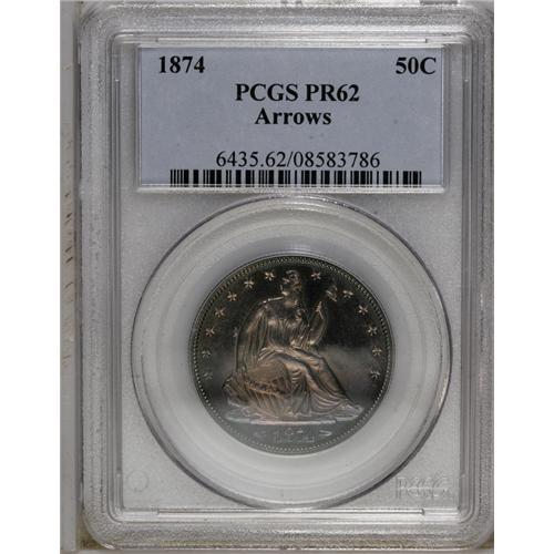 <B>1874<50C> Arrows PR62 PCGS.</B></I> Aqua-blue and mauve hues enrich this nicely struck and prominently mirrored specimen. A mint-made planchet flaw at 4 o'clock is accompanied by a few wispy hairlines. A desirable proof type, coined only in 1873 and 1874 with a combined proof mintage of 1,250 pieces.