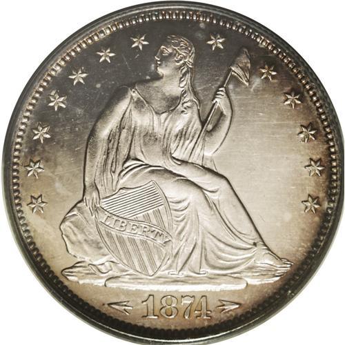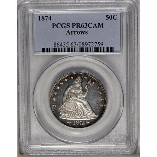 <B>1874<50C> Arrows PR63 Cameo PCGS.</B></I> A thin ring of reddish-russet patina circles both sides of this otherwise silver-gray specimen. Nearly every design element is fully defined, and there is very little evidence of mishandling on either the obverse or the reverse. A problem-free Select proof specimen with pleasingly original eye appeal. Perfect for high grade proof type purposes.