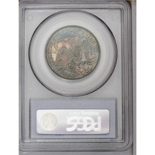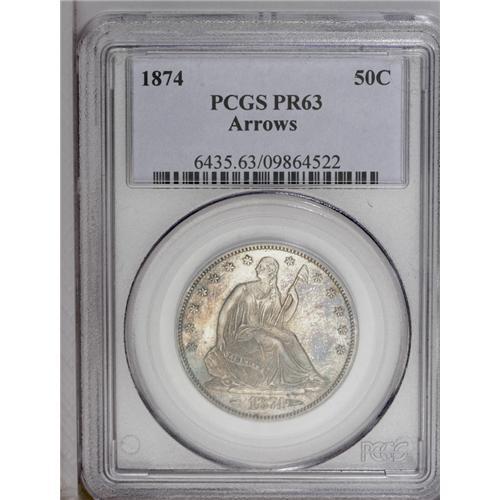 <B>1874<50C> Arrows PR63 PCGS.</B></I> Splashes of aqua-blue, plum, and russet adorn this suitably struck and attractive specimen. A pinscratch concealed on the olive branch limits the grade. A tough proof type, since Motto Arrow halves were only struck for two years. For the 1874, just 700 proofs were struck.