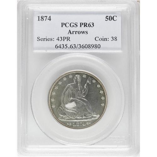 <B>1874 50C Arrows PR63 PCGS.</B></I> WB-101. Small Arrows. Randy Wiley and Bill Bugert (1993) note that this variety is far scarcer than WB-102 (Large Arrows). From a mintage of 700 to 750 pieces, this is a glassy, essentially brilliant specimen that exhibits razor-sharp definition on the design features. Some fine hairlines visible under magnification limit the grade. Important two-year proof type.<BR><BR><b>Shipping:</b> Coins & Currency (<a target="_blank" href="http://www.heritageauctions.com/common/shipping.php">view shipping information</a>)