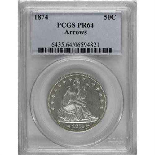 <B>1874 50C Arrows PR64 PCGS.</B></I> WB-101. Small Arrows. According to Wiley & Bugert (1993), the Small Arrows variety is: "Usually found as a proof and by far scarcer than WB-102". This example is crisply struck throughout, with mildly reflective fields that only reveal a trace of milkiness and a few stray hairlines. Carefully preserved and free of contact marks. <BR><BR><B>Coin Engraver:</B> Christian Gobrecht<BR><BR><b>Shipping:</b> Coins & Currency (<a target="_blank" href="http://www.heritageauctions.com/common/shipping.php">view shipping information</a>)