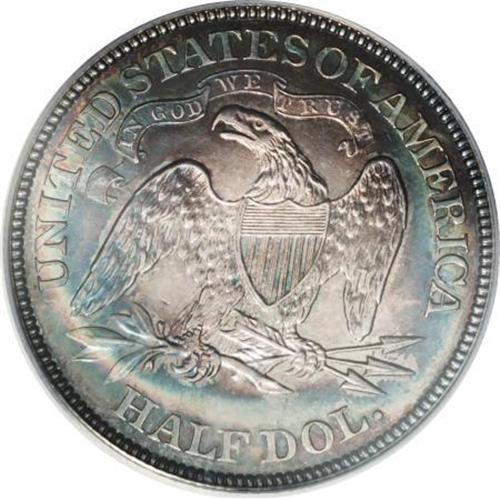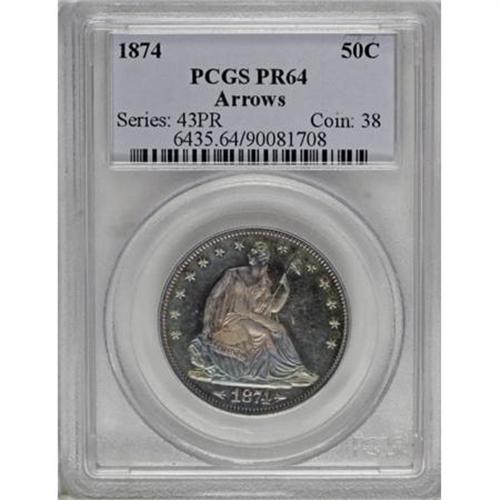 <B>1874 50C Arrows PR64 PCGS.</B></I> Bright, sparkling mirrors flash brightly from the fields on each side, and each side is toned in concentric shades of turquoise and golden-violet. The striking definition shows pinpoint definition throughout. A few wispy hairlines in the fields are of little consequence on this eye appealing two-year type coin. Population: 55 in 64, 18 finer (8/07).<BR><BR><BR><B>Coin Engraver:</B> Christian Gobrecht<BR><BR><b>Shipping:</b> Coins & Currency (<a target="_blank" href="http://www.heritageauctions.com/common/shipping.php">view shipping information</a>)