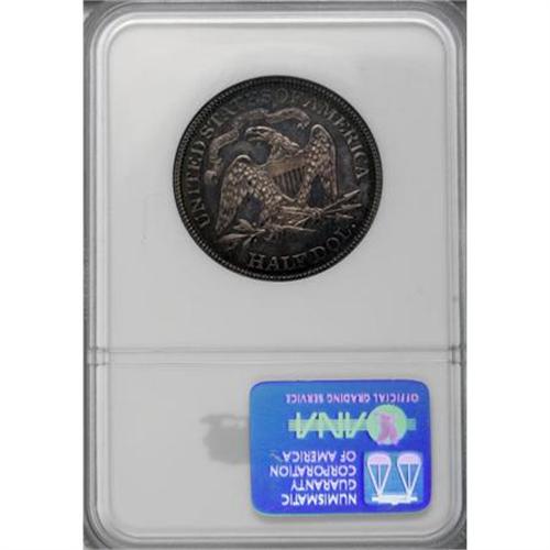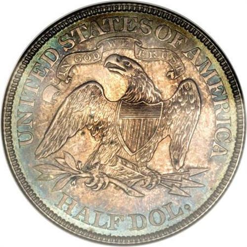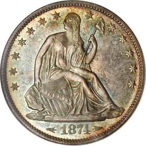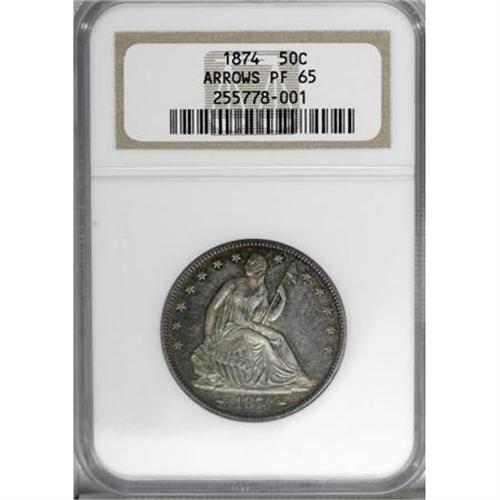 <B>1874 50C Arrows PR65 NGC.</B></I> A gorgeous Gem proof with natural iridescence on both sides. Near flawless surfaces with proof mirrors that are somewhat subdued by heather, sea-green, and gold toning on both sides. Little cameo contrast remains, but the overall aesthetic appeal is excellent. Census: 13 in 65, 7 finer (10/07).<BR><I>From The Fleur Wales-Baillie Collection.</B></I><BR><BR><B>Coin Engraver:</B> Christian Gobrecht<BR><BR><b>Shipping:</b> Coins & Currency (<a target="_blank" href="http://www.heritageauctions.com/common/shipping.php">view shipping information</a>)