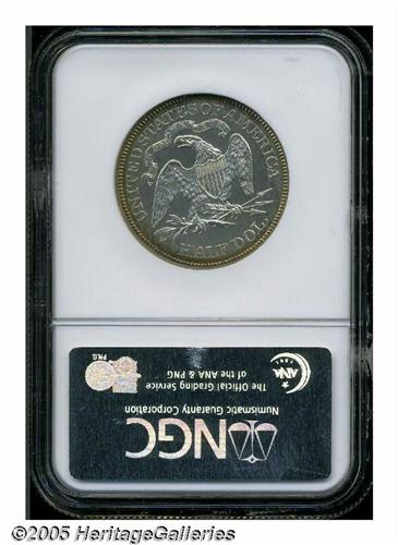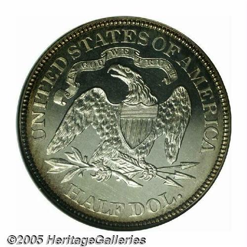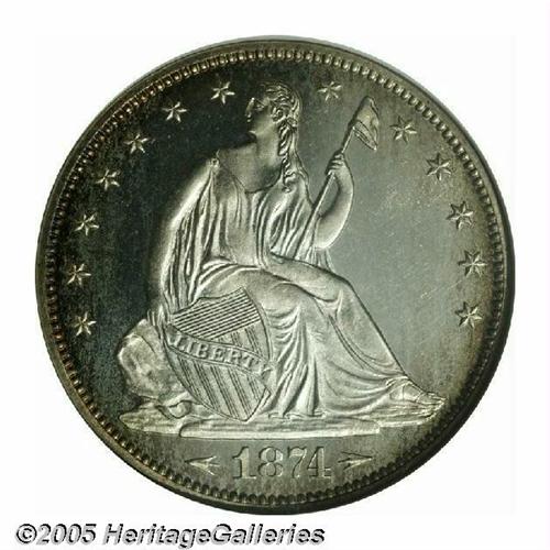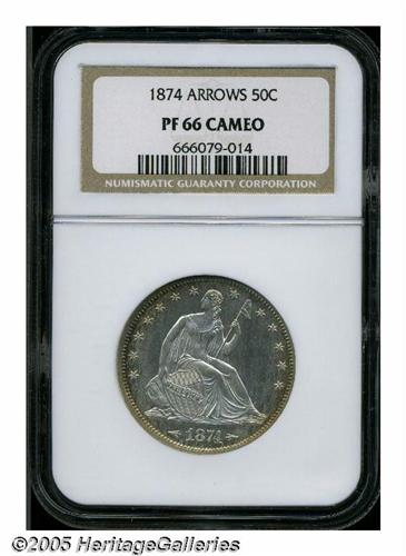 <B>1874<50C> Arrows PR66 Cameo NGC.</B></I> WB-101, Breen-4982. This is the Small Arrows or Short Arrows variety, depending on which reference is consulted. Whether you want to call it the Short Arrows variety as did Breen, or the Small Arrows variety per Wiley and Bugert, it is important to note that business strike examples of this variety are seldom encountered. Therefore, the surviving Proofs provide the best opportunity for the advanced variety collector. Not only is this a candidate for the variety collector, but it will also suit the date or type collector. Seldom are examples of this date or type found in such preservation.