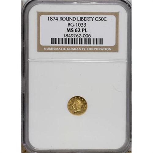<B>1874 50C BG-1033 MS62 Prooflike NGC.</B></I> NGC Census: (0/0). PCGS Population (0/0). (#710862)<BR><BR><b>Shipping:</b> Coins & Currency (<a target="_blank" href="http://www.heritageauctions.com/common/shipping.php">view shipping information</a>)