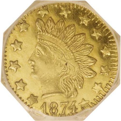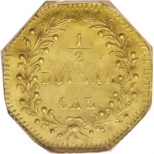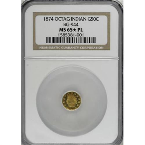 <B>1874 50C BG-944, R.5 MS65 </B></I> S<B> Prooflike NGC.</B></I> The Breen-Gillio reference (2003) credits Kenneth W. Lee, author of his own noted work on California fractional gold, with the discovery of this issue sometime between 1955 and 1970. This gleaming honey-gold Gem offers sharply reflective fields and pleasing detail, with only a touch of lessened reflectivity on the reverse opposite the portrait. NGC has certified just four examples, all Prooflike, with this Gem the single finest representative (7/07).<BR><BR><b>Shipping:</b> Coins & Currency (<a target="_blank" href="http://www.heritageauctions.com/common/shipping.php">view shipping information</a>\)