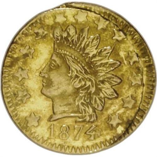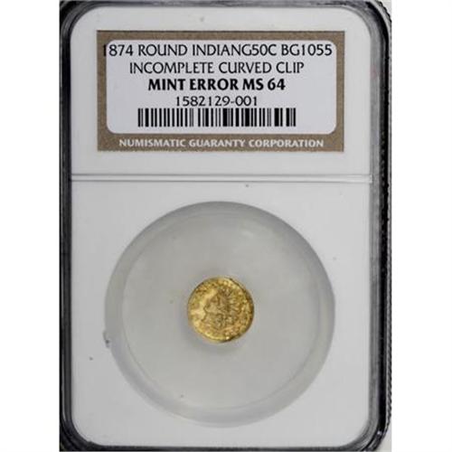 <B>1874 50C Indian Round 50 Cents--Incomplete Curved Clip--BG-1055, High R.4, MS64 NGC.</B></I> <BR><BR><b>Shipping:</b> Coins & Currency (<a target="_blank" href="http://www.heritageauctions.com/common/shipping.php">view shipping information</a>)