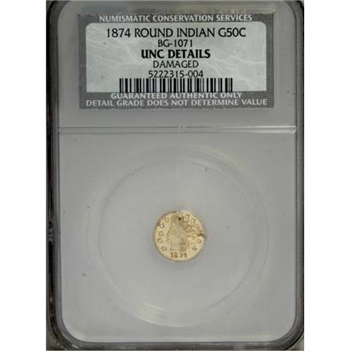 <B>1874 50C Indian Round 50 Cents, BG-1071, R.7--Damaged--NCS. Unc. Details.</B></I> A small, neat hole is present near 12 o'clock between a star and the headdress. The reverse, which is rotated 90 degrees, has a deep mark near 12 o'clock that affects the obverse opposite at 3 o'clock. The reverse is lightly hairlined. Still a very rare variety with only one other Heritage auction appearance this decade.<BR><BR><b>Shipping:</b> Coins & Currency (<a target="_blank" href="http://www.heritageauctions.com/common/shipping.php">view shipping information</a>)