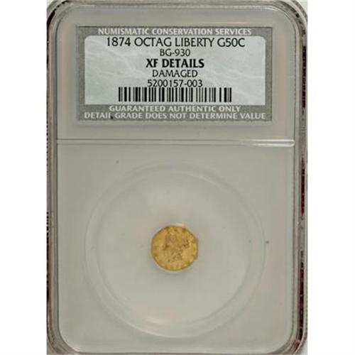 <B>1874 50C Liberty Octagonal 50 Cents, BG-930, R.5,--Damaged--NCS. XF Details.</B></I> NGC Census: (0/0). PCGS Population (0/38). (#10788)<BR><BR><b>Shipping:</b> Coins & Currency (<a target="_blank" href="http://www.heritageauctions.com/common/shipping.php">view shipping information</a>)