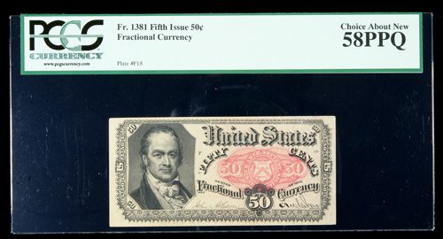 1874, 50¢ Fractional Currency. Fifth Issue, white paper. PCGS Choice About New 58PPQ. . Fr-1381. A very lightly handled, strictly original Crawford note.