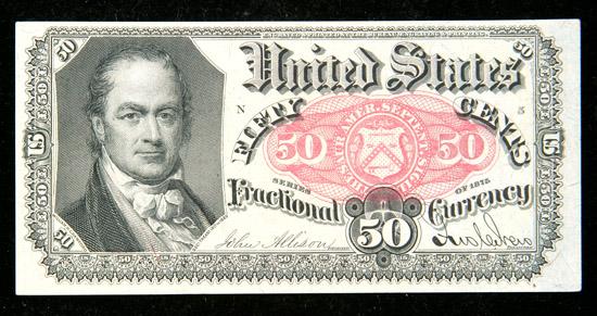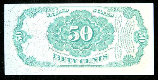 1874, 50c Fractional Currency. Fifth Issue, white paper with silk fibers and blue right end