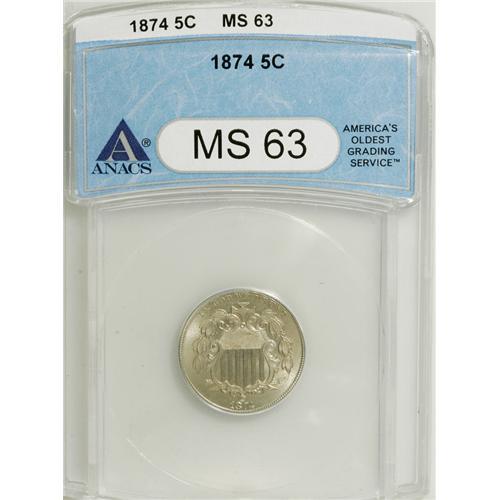 <B>1874 5C MS63 ANACS.</B></I> NGC Census: (21/62). PCGS Population (44/95). Mintage: 3,538,000. Numismedia Wsl. Price: $240. (#3803)<BR><BR><b>Shipping:</b> Coins & Currency (<a target="_blank" href="http://www.heritageauctions.com/common/shipping.php">view shipping information</a>)