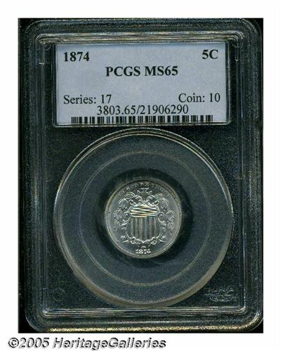 <B>1874<5C> MS65 PCGS.</B></I> A flashy, lustrous, untoned Gem, with a bold strike and very clean surfaces. Population: 23 in 65, 5 finer (3/05).