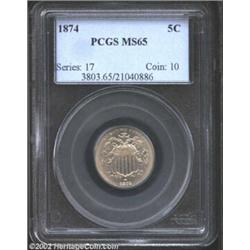 1874 5C MS65 PCGS. A lightly toned and lustrous Gem with clean surfaces and a reasonable strike. A t