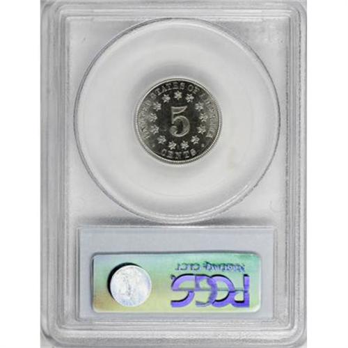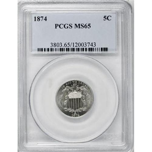<B>1874 5C MS65 PCGS.</B></I> Frosty nickel-gray surfaces accompany nearly full design elements on this beautiful example. Both sides have numerous die cracks like so many Shield nickels. The mint had little experience with the composition, which is harder than most other coin alloys. As a result, die cracks were the norm, not the exception. Population: 29 in 65, 5 finer (12/07).<BR><BR><B>Coin Engraver:</B> James B. Longacre<BR><BR><b>Shipping:</b> Coins & Currency (<a target="_blank" href="http://www.heritageauctions.com/common/shipping.php">view shipping information</a>)