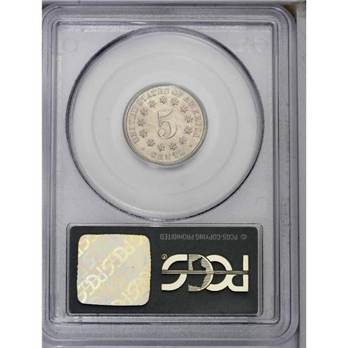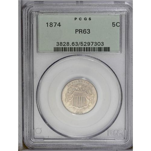 <B>1874<5C> PR63 PCGS.</B></I> The fields are moderately reflective and each side has a light overlay of toning with considerable underlying brilliance. Hairlined, thus the grade. <BR><BR><B>Important notice:</B> Heritage usually auctions material at the rate of 200-250 lots per hour. On some occasions eBay Live bid software or the Internet may not be able to keep up with the pace of the auction. We recommend placing a realistic absentee bid now as insurance to avoid disappointment. Occasionally the auctioneer may eliminate or reject an eBay Live bid, and the auctioneer may also reopen a lot after the close of the eBay live bidding (usually because we missed an audience bid), and may reject your bid even if it shows you as the winning bidder. By bidding via eBay Live, you agree that Heritage may award the lot to another bidder at its sole discretion under the circumstances described above or any other reasonable circumstances. Since eBay bids are not shown to us until we open the lot on the floor, we treat those bids just like floor bids. In most cases the floor responds before the eBay bid is presented to us, due to Internet lag time, so for consistency we have made it a policy that floor bids are always considered first over tie eBay live bids. Also please note that all Heritage lots purchased through eBay Live carry a 20% Buyer's Premium. Please make sure you read the Terms and Conditions before you bid. This lot is being auctioned in conjunction with a live floor auction by Heritage Galleries & Auctioneers. All final auction and invoice information will be supplied by Heritage Galleries & Auctioneers, and all other information should be considered preliminary. Lot:885 <BR><BR><B>Winning Notification and Billing:</B> After the FINAL session in this auction is complete, Heritage will send e-mail and snail mail invoices. This process normally takes several days. All final auction and invoice information will be supplied by Heritage Galleries & Auctioneers, and all other information should be considered preliminary. <BR><BR>This auction will be conducted on a live auction floor and over the Internet through eBay Live. If you choose to place an absentee bid, please take a moment to <font color='#0000ff'><u><a href='http://pages.ebay.com/liveauctions/help/before/laabsentee.html'>learn how eBay Live absentee bidding works</a></u></font><font color='#000000'>