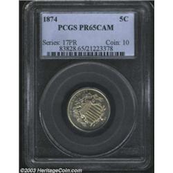 <TABLE cellSpacing=0 cellPadding=0 width="100%" bgColor=#000000 border=0><TBODY><TR><TD width="100%"><TABLE cellSpacing=1 cellPadding=3 width="100%" border=0><TBODY><TR><TD width="100%" bgColor=#79735c><FONT face=arial color=#ffffff size=3><B>Description</B> </FONT></TD></TR><TR><TD width="100%" bgColor=#ffffff><FONT face=arial size=2><B>1874 5C PR65 Cameo PCGS.</B></I> Fully struck and mildly reflective, with lovely cameo contrast on both sides. There are a few minor handling marks near the reverse center. Population: 8 in 65, 5 finer (4/03). </FONT></TD></TR></TBODY></TABLE></TD></TR></TBODY></TABLE><BR><A name=PricesRealized></A><TABLE cellSpacing=0 cellPadding=0 width="100%" bgColor=#000000 border=0><TBODY><TR><TD width="100%"><TABLE cellSpacing=1 cellPadding=3 width="100%" border=0><TBODY><TR><TD width="100%" bgColor=#79735c><A name=PR><FONT face=arial color=#ffffff size=3><B>Previous Prices from Heritage Auctions</B> </FONT></A></TD></TR><TR><TD bgColor=#f6f6ed><TABLE cellSpacing=0 cellPadding=0 width="100%" border=1><TBODY><TR><TD align=middle width="33%"><B>Date</B></TD><TD align=middle width="33%"><B>Service</B></TD><TD align=middle width="33%"><B>Price</B></TD></TR><TR bgColor=whitesmoke><TD width="33%"><B>01/11/2003</B></TD><TD width="33%">PCGS</TD><TD width="33%">$977.50</TD></TR><TR bgColor=whitesmoke><TD width="33%"><B>09/28/2002</B></TD><TD width="33%">PCGS</TD><TD width="33%">$1,063.75</TD></TR></TBODY></TABLE></TD></TR><TR><TD bgColor=#ffffff><FONT face=arial size=1 ?>PLEASE NOTE: All prices realized reflect the final hammer price PLUS the buyer's premium in auctions that charge a buyer's premium. Each item has a notation at the top of the listing indicating whether that lot included a buyer's premium. Example: A item that sells with a final hammer price of $100 and a 20% buyer's premium will display with a price realized of $120. All information listed is intended to be as accurate as possible, but errors are possible. Please use this guide carefully and inform us of any inaccuracies. </FONT></TD></TR></TBODY></TABLE></TD></TR></TBODY></TABLE><BR><TABLE cellSpacing=0 cellPadding=0 width="100%" bgColor=#000000 border=0><TBODY><TR><TD width="100%"><TABLE cellSpacing=1 cellPadding=3 width="100%" border=0><TBODY><TR><TD width="100%" bgColor=#79735c colSpan=6><FONT face=arial color=#ffffff size=3><B>Price Guide*</B> </FONT></TD></TR><TR bgColor=#f6f6ed><TD align=middle><B>Grade</B> </TD><TD align=middle><B>Coin World<BR>(Trends)</B> </TD><TD align=middle><B>Numismedia<BR>Retail</B> </TD><TD align=middle><B>Numismedia<BR>Wholesale</B> </TD><TD align=middle><B>Coin<BR>Universe</B> </TD><TD align=middle><B>Heritage<BR>Value Index</B> </TD></TR><TR bgColor=#ffffff><TD align=middle>64</TD><TD align=right>---</TD><TD align=right>---</TD><TD align=right>---</TD><TD align=right>---</TD><TD align=right>$401.50</TD></TR><TR style="FONT-WEIGHT: bold" bgColor=#cccfdd><TD align=middle>65</TD><TD align=right>---</TD><TD align=right>---</TD><TD align=right>---</TD><TD align=right>---</TD><TD align=right>$813.75</TD></TR><TR bgColor=#ffffff><TD align=middle>66</TD><TD align=right>---</TD><TD align=right>---</TD><TD align=right>---</TD><TD align=right>---</TD><TD align=right>---</TD></TR><TR bgColor=#ffffff><TD colSpan=6><FONT size=1>*All information listed is intended to be as accurate as possible, but errors are possible. No item may be returned or refused based on this information which is provided as a service to our customers. You should contact each pricing source directly to determine the accuracy of this information. </FONT></TD></TR></TBODY></TABLE></TD></TR></TBODY></TABLE><BR><TABLE cellSpacing=0 cellPadding=0 width="100%" bgColor=#000000 border=0><TBODY><TR><TD width="100%"><TABLE cellSpacing=1 cellPadding=3 width="100%" border=0><TBODY><TR><TD width="100%" bgColor=#79735c><FONT face=arial color=#ffffff size=3><B>Population Guide</B> </FONT></TD></TR><TR bgColor=#ffffff><TD align=middle><!-- Begin Output of Population Grid--><TABLE cellSpacing=0 cellPadding=0 width="100%" border=0><TBODY><TR><TD vAlign=center><TABLE cellSpacing=0 width="100%" border=1 cellsadding="3"><TBODY><TR><TD vAlign=center><TABLE cellSpacing=0 cellPadding=3 width="100%" border=1><TBODY><TR><TD vAlign=center align=middle bgColor=#f0f1e8 colSpan=2 <CENTER><FONT face=Arial size=2><B>PCGS Pop </B></FONT><CENTER></CENTER></TD><TD vAlign=center align=middle bgColor=#f0f1e8 colSpan=2><CENTER><FONT face=Arial size=2><B>NGC Pop</B></CENTER></FONT></TD></TR><TR><TD vAlign=center><FONT face=Arial size=2>(65)</FONT> </TD><TD vAlign=center align=right><FONT face=Arial size=2>8</FONT> </TD><TD vAlign=center><FONT face=Arial size=2>(65)</FONT> </TD><TD vAlign=center align=right><FONT face=Arial size=2>1</FONT> </TD></TR><TR><TD vAlign=center><FONT face=Arial size=2>(>65)</FONT> </TD><TD vAlign=center align=right><FONT face=Arial size=2>5</FONT> </TD><TD vAlign=center><FONT face=Arial size=2>(>65)</FONT> </TD><TD vAlign=center align=right><FONT face=Arial size=2>4</FONT> </TD></TR></TBODY></TABLE></TD></TR></TBODY></TABLE></TD></TR></TBODY></TABLE><!-- End Output of Population Grid--> Important notice: Heritage usually auctions material at the rate of 200-250 lots per hour. On some occasions eBay Live bid software or the Internet may not be able to keep up with the pace of the auction. We recommend placing a realistic absentee bid now as insurance to avoid disappointment. Occasionally the auctioneer may eliminate or reject an eBay Live bid, and the auctioneer may also reopen a lot after the close of the eBay live bidding (usually because we missed an audience bid), and may reject your bid even if it shows you as the winning bidder. By bidding via eBay Live, you agree that Heritage may award the lot to another bidder at its sole discretion under the circumstances described above or any other reasonable circumstances. Also please note that all Heritage lots purchased through eBay Live carry a 20% Buyer's Premium. Please make
