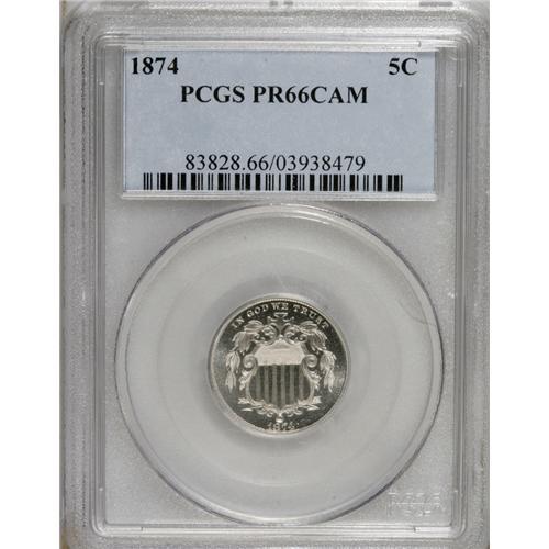 <B>1874 5C PR66 Cameo PCGS.</B></I> Fletcher-4. The 74 in the date is lightly repunched. This nearly brilliant Premium Gem has flashy and unabraded fields. The shield is lightly frosted, and striking incompleteness is mostly limited to the star near the C in AMERICA. Population: 7 in 66 Cameo, 2 finer (2/07).<BR><BR><b>Shipping:</b> Coins & Currency (<a target="_blank" href="http://www.heritageauctions.com/common/shipping.php">view shipping information</a>)