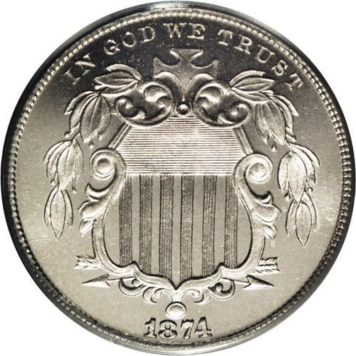 1874 5C PR66 Cameo PCGS. The crisp, clean silver-white 1874[5C] PR66 Cameo PCGS.