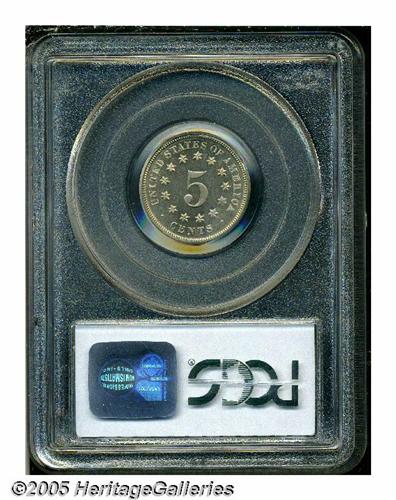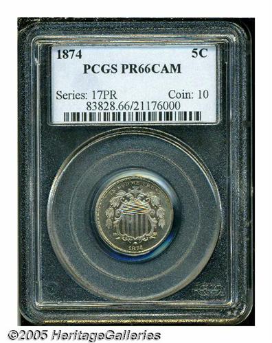 <B>1874<5C> PR66 Cameo PCGS.</B></I> Warmly patinated in golden hues, the silky-smooth surfaces are sharply struck and well frosted over all of the devices. Perfect for inclusion in an advanced proof Shield Nickel collection. Population: 6 in 66 Cameo, 1 finer (5/05).<BR><I>From The Western Hills Collection.</B></I>