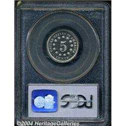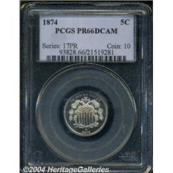 <B>1874<5C> PR66 Deep Cameo PCGS.</B></I> The first and only specimen to achieve this lofty grade, at PCGS, and the only example to given the Deep Cameo designation (4/04). This absolutely amazing piece displays a stunning combination of technical merit and visual appeal, with well-executed striking details, dazzlingly flashy, deeply mirrored fields, and virtually pristine proof surfaces overall. Each side has a small, curly lintmark (as struck), one of which resides on the large number 5, while the other rests near the obverse rim at approximately 2 o'clock. <BR><BR><B>Important notice:</B> Heritage usually auctions material at the rate of 200-250 lots per hour. On some occasions eBay Live bid software or the Internet may not be able to keep up with the pace of the auction. We recommend placing a realistic absentee bid now as insurance to avoid disappointment. Occasionally the auctioneer may eliminate or reject an eBay Live bid, and the auctioneer may also reopen a lot after the close of the eBay live bidding (usually because we missed an audience bid), and may reject your bid even if it shows you as the winning bidder. By bidding via eBay Live, you agree that Heritage may award the lot to another bidder at its sole discretion under the circumstances described above or any other reasonable circumstances. Since eBay bids are not shown to us until we open the lot on the floor, we treat those bids just like floor bids. In most cases the floor responds before the eBay bid is presented to us, due to Internet lag time, so for consistency we have made it a policy that floor bids are always considered first over tie eBay live bids. Also please note that all Heritage lots purchased through eBay Live carry a 20% Buyer's Premium. Please make sure you read the Terms and Conditions before you bid.