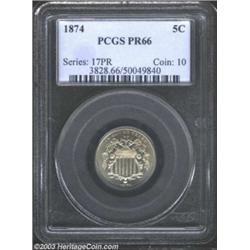 <TABLE cellSpacing=0 cellPadding=0 width="100%" bgColor=#000000 border=0><TBODY><TR><TD width="100%"><TABLE cellSpacing=1 cellPadding=3 width="100%" border=0><TBODY><TR><TD width="100%" bgColor=#79735c><FONT face=arial color=#ffffff size=3><B>Description</B> </FONT></TD></TR><TR><TD width="100%" bgColor=#ffffff><FONT face=arial size=2><B>1874 5C PR66 PCGS.</B></I> A beautiful Gem proof, with a bright radiant sheen. The reverse stars are repunched, and there is one notable contact mark, on the lower part of the large number 5. Otherwise, the coin displays a full strike and a seemingly pristine obverse. Population: 30 in 66, 6 finer (8/03). </FONT></TD></TR></TBODY></TABLE></TD></TR></TBODY></TABLE><BR><A name=PricesRealized></A><TABLE cellSpacing=0 cellPadding=0 width="100%" bgColor=#000000 border=0><TBODY><TR><TD width="100%"><TABLE cellSpacing=1 cellPadding=3 width="100%" border=0><TBODY><TR><TD width="100%" bgColor=#79735c><A name=PR><FONT face=arial color=#ffffff size=3><B>Previous Prices from Heritage Auctions</B> </FONT></A></TD></TR><TR><TD bgColor=#f6f6ed><TABLE cellSpacing=0 cellPadding=0 width="100%" border=1><TBODY><TR><TD align=middle width="33%"><B>Date</B></TD><TD align=middle width="33%"><B>Service</B></TD><TD align=middle width="33%"><B>Price</B></TD></TR><TR bgColor=whitesmoke><TD width="33%"><B>02/19/2002</B></TD><TD width="33%">PCGS</TD><TD width="33%">$1,006.25</TD></TR><TR bgColor=whitesmoke><TD width="33%"><B>09/01/1999</B></TD><TD width="33%">PCGS</TD><TD width="33%">$1,495.00</TD></TR><TR bgColor=whitesmoke><TD width="33%"><B>03/01/1997</B></TD><TD width="33%">PCGS</TD><TD width="33%">$1,155.00</TD></TR><TR bgColor=whitesmoke><TD width="33%"><B>09/10/1997</B></TD><TD width="33%">NGC</TD><TD width="33%">$990.00</TD></TR><TR bgColor=whitesmoke><TD width="33%"><B>08/14/1999</B></TD><TD width="33%">NGC</TD><TD width="33%">$891.25</TD></TR><TR bgColor=whitesmoke><TD width="33%"><B>06/01/2000</B></TD><TD width="33%">NGC</TD><TD width="33%">$805.00</TD></TR><TR bgColor=whitesmoke><TD width="33%"><B>07/29/2003</B></TD><TD width="33%">PCGS</TD><TD width="33%">$805.00</TD></TR></TBODY></TABLE></TD></TR><TR><TD bgColor=#ffffff><FONT face=arial size=1 ?>PLEASE NOTE: All prices realized reflect the final hammer price PLUS the buyer's premium in auctions that charge a buyer's premium. Each item has a notation at the top of the listing indicating whether that lot included a buyer's premium. Example: A item that sells with a final hammer price of $100 and a 20% buyer's premium will display with a price realized of $120. All information listed is intended to be as accurate as possible, but errors are possible. Please use this guide carefully and inform us of any inaccuracies. </FONT></TD></TR></TBODY></TABLE></TD></TR></TBODY></TABLE><BR><TABLE cellSpacing=0 cellPadding=0 width="100%" bgColor=#000000 border=0><TBODY><TR><TD width="100%"><TABLE cellSpacing=1 cellPadding=3 width="100%" border=0><TBODY><TR><TD width="100%" bgColor=#79735c colSpan=6><FONT face=arial color=#ffffff size=3><B>Price Guide*</B> </FONT></TD></TR><TR bgColor=#f6f6ed><TD align=middle><B>Grade</B> </TD><TD align=middle><B>Coin World<BR>(Trends)</B> </TD><TD align=middle><B>Numismedia<BR>Retail</B> </TD><TD align=middle><B>Numismedia<BR>Wholesale</B> </TD><TD align=middle><B>Coin<BR>Universe</B> </TD><TD align=middle><B>Heritage<BR>Value Index</B> </TD></TR><TR bgColor=#ffffff><TD align=middle>65</TD><TD align=right>---</TD><TD align=right>$940.00</TD><TD align=right>$755.00</TD><TD align=right>$1,125.00</TD><TD align=right>$696.67</TD></TR><TR style="FONT-WEIGHT: bold" bgColor=#cccfdd><TD align=middle>66</TD><TD align=right>---</TD><TD align=right>---</TD><TD align=right>$950.00</TD><TD align=right>$1,575.00</TD><TD align=right>$988.75</TD></TR><TR bgColor=#ffffff><TD align=middle>67</TD><TD align=right>---</TD><TD align=right>---</TD><TD align=right>$2,900.00</TD><TD align=right>---</TD><TD align=right>---</TD></TR><TR bgColor=#ffffff><TD colSpan=6><FONT size=1>*All information listed is intended to be as accurate as possible, but errors are possible. No item may be returned or refused based on this information which is provided as a service to our customers. You should contact each pricing source directly to determine the accuracy of this information. </FONT></TD></TR></TBODY></TABLE></TD></TR></TBODY></TABLE><BR><TABLE cellSpacing=0 cellPadding=0 width="100%" bgColor=#000000 border=0><TBODY><TR><TD width="100%"><TABLE cellSpacing=1 cellPadding=3 width="100%" border=0><TBODY><TR><TD width="100%" bgColor=#79735c><FONT face=arial color=#ffffff size=3><B>Population Guide</B> </FONT></TD></TR><TR bgColor=#ffffff><TD align=middle><!-- Begin Output of Population Grid--><TABLE cellSpacing=0 cellPadding=0 width="100%" border=0><TBODY><TR><TD vAlign=center><TABLE cellSpacing=0 width="100%" border=1 cellsadding="3"><TBODY><TR><TD vAlign=center><TABLE cellSpacing=0 cellPadding=3 width="100%" border=1><TBODY><TR><TD vAlign=center align=middle bgColor=#f0f1e8 colSpan=2 <CENTER><FONT face=Arial size=2><B>PCGS Pop </B></FONT><CENTER></CENTER></TD><TD vAlign=center align=middle bgColor=#f0f1e8 colSpan=2><CENTER><FONT face=Arial size=2><B>NGC Pop</B></CENTER></FONT></TD></TR><TR><TD vAlign=center><FONT face=Arial size=2>(66)</FONT> </TD><TD vAlign=center align=right><FONT face=Arial size=2>30</FONT> </TD><TD vAlign=center><FONT face=Arial size=2>(66)</FONT> </TD><TD vAlign=center align=right><FONT face=Arial size=2>29</FONT> </TD></TR><TR><TD vAlign=center><FONT face=Arial size=2>(>66)</FONT> </TD><TD vAlign=center align=right><FONT face=Arial size=2>6</FONT> </TD><TD vAlign=center><FONT face=Arial size=2>(>66)</FONT> </TD><TD vAlign=center align=right><FONT face=Arial size=2>2</FONT> </TD></TR></TBODY></TABLE></TD></TR></TBODY></TABLE></TD></TR></TBODY></TABLE><!-- End Output of Population Grid--> Important notice: Heritage usually auctions material at the rate of 200-250 lots per hour. On some occasions eBay Live bid softwa