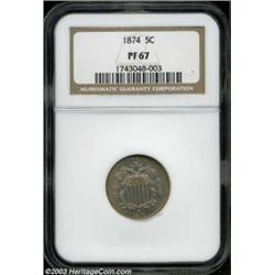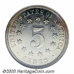 <table><tr><td><TABLE cellSpacing=0 cellPadding=0 width="100%" bgColor=#000000 border=0><TBODY> <TR><TD width="100%"><TABLE cellSpacing=1 cellPadding=3 width="100%" border=0><TBODY><TR><TD width="100%" bgColor=#79735c><FONT face=arial color=#ffffff size=3><B>Description</B> </FONT></TD></TR><TR><TD width="100%" bgColor=#ffffff><FONT face=arial size=2><B>1874 5C PR67 NGC.</B></I> Exceptional overall quality even though somewhat shallowly mirrored in the fields. The surfaces approach technical perfection and each side has pale gray centers with rich golden-rose coloration around the margins. Population: 2 in 67, 0 finer (7/03). </FONT></TD></TR></TBODY></TABLE></TD></TR></TBODY></TABLE><BR><A name=PricesRealized></A><TABLE cellSpacing=0 cellPadding=0 width="100%" bgColor=#000000 border=0><TBODY><TR><TD width="100%"><TABLE cellSpacing=1 cellPadding=3 width="100%" border=0><TBODY><TR><TD width="100%" bgColor=#79735c><A name=PR><FONT face=arial color=#ffffff size=3><B>Previous Prices from Heritage Auctions</B> </FONT></A></TD></TR><TR><TD bgColor=#f6f6ed><TABLE cellSpacing=0 cellPadding=0 width="100%" border=1><TBODY><TR><TD align=middle width="33%"><B>Date</B></TD><TD align=middle width="33%"><B>Service</B></TD><TD align=middle width="33%"><B>Price</B></TD></TR><TR bgColor=whitesmoke><TD width="33%"><B>11/07/1998</B></TD><TD width="33%">NGC</TD><TD width="33%">$2,200.00</TD></TR></TBODY></TABLE></TD></TR><TR><TD bgColor=#ffffff><FONT face=arial size=1 ?>PLEASE NOTE: All prices realized reflect the final hammer price PLUS the buyer's premium in auctions that charge a buyer's premium. Each item has a notation at the top of the listing indicating whether that lot included a buyer's premium. Example: A item that sells with a final hammer price of $100 and a 20% buyer's premium will display with a price realized of $120. All information listed is intended to be as accurate as possible, but errors are possible. Please use this guide carefully and inform us of any inaccuracies. </FONT></TD></TR></TBODY></TABLE></TD></TR></TBODY></TABLE><BR><TABLE cellSpacing=0 cellPadding=0 width="100%" bgColor=#000000 border=0><TBODY><TR><TD width="100%"><TABLE cellSpacing=1 cellPadding=3 width="100%" border=0><TBODY><TR><TD width="100%" bgColor=#79735c colSpan=6><FONT face=arial color=#ffffff size=3><B>Price Guide*</B> </FONT></TD></TR><TR bgColor=#f6f6ed><TD align=middle><B>Grade</B> </TD><TD align=middle><B>Coin World<BR>(Trends)</B> </TD><TD align=middle><B>Numismedia<BR>Retail</B> </TD><TD align=middle><B>Numismedia<BR>Wholesale</B> </TD><TD align=middle><B>Coin<BR>Universe</B> </TD><TD align=middle><B>Heritage<BR>Value Index</B> </TD></TR><TR bgColor=#ffffff><TD align=middle>66</TD><TD align=right>---</TD><TD align=right>---</TD><TD align=right>$950.00</TD><TD align=right>$1,575.00</TD><TD align=right>$951.25</TD></TR><TR style="FONT-WEIGHT: bold" bgColor=#cccfdd><TD align=middle>67</TD><TD align=right>---</TD><TD align=right>---</TD><TD align=right>$2,900.00</TD><TD align=right>---</TD><TD align=right>---</TD></TR><TR bgColor=#ffffff><TD align=middle>68</TD><TD align=right>---</TD><TD align=right>---</TD><TD align=right>---</TD><TD align=right>---</TD><TD align=right>---</TD></TR><TR bgColor=#ffffff><TD colSpan=6><FONT size=1>*All information listed is intended to be as accurate as possible, but errors are possible. No item may be returned or refused based on this information which is provided as a service to our customers. You should contact each pricing source directly to determine the accuracy of this information. </FONT></TD></TR></TBODY></TABLE></TD></TR></TBODY></TABLE><BR><TABLE cellSpacing=0 cellPadding=0 width="100%" bgColor=#000000 border=0><TBODY><TR><TD width="100%"><TABLE cellSpacing=1 cellPadding=3 width="100%" border=0><TBODY><TR><TD width="100%" bgColor=#79735c><FONT face=arial color=#ffffff size=3><B>Population Guide</B> </FONT></TD></TR><TR bgColor=#ffffff><TD align=middle><!-- Begin Output of Population Grid--><TABLE cellSpacing=0 cellPadding=0 width="100%" border=0><TBODY><TR><TD vAlign=center><TABLE cellSpacing=0 width="100%" border=1 cellsadding="3"><TBODY><TR><TD vAlign=center><TABLE cellSpacing=0 cellPadding=3 width="100%" border=1><TBODY><TR><TD vAlign=center align=middle bgColor=#f0f1e8 colSpan=2 <CENTER><FONT face=Arial size=2><B>PCGS Pop </B></FONT><CENTER></CENTER></TD><TD vAlign=center align=middle bgColor=#f0f1e8 colSpan=2><CENTER><FONT face=Arial size=2><B>NGC Pop</B></CENTER></FONT></TD></TR><TR><TD vAlign=center><FONT face=Arial size=2>(67)</FONT> </TD><TD vAlign=center align=right><FONT face=Arial size=2>6</FONT> </TD><TD vAlign=center><FONT face=Arial size=2>(67)</FONT> </TD><TD vAlign=center align=right><FONT face=Arial size=2>2</FONT> </TD></TR><TR><TD vAlign=center><FONT face=Arial size=2>(>67)</FONT> </TD><TD vAlign=center align=right><FONT face=Arial size=2>0</FONT> </TD><TD vAlign=center><FONT face=Arial size=2>(>67)</FONT> </TD><TD vAlign=center align=right><FONT face=Arial size=2>0</FONT> </TD></TR></TBODY></TABLE></TD></TR></TBODY></TABLE></TD></TR></TBODY></TABLE><!-- End Output of Population Grid--></TD></TR></TBODY></TABLE></TD></TR></TBODY></TABLE><BR><TABLE cellSpacing=0 cellPadding=0 width="100%" bgColor=#000000 border=0><TBODY><TR> Important notice: Heritage usually auctions material at the rate of 200-250 lots per hour. On some occasions eBay Live bid software or the Internet may not be able to keep up with the pace of the auction. We recommend placing a realistic absentee bid now as insurance to avoid disappointment. Occasionally the auctioneer may eliminate or reject an eBay Live bid, and the auctioneer may also reopen a lot after the close of the eBay live bidding (usually because we missed an audience bid), and may reject your bid even if it shows you as the winning bidder. By bidding via eBay Live, you agree that Heritage may award the lot to another bidder at its sole discretion under the circumstances described above or any other reasonable circums