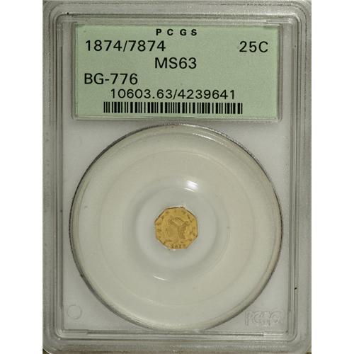 <B>1874/7874 25C Liberty Octagonal 25 Cents, BG-776, Low R.5, MS63 PCGS.</B></I> PCGS Population (19/2). NGC Census: (0/0). (#10603)<BR><BR><b>Shipping:</b> Coins & Currency (<a target="_blank" href="http://www.heritageauctions.com/common/shipping.php">view shipping information</a>)